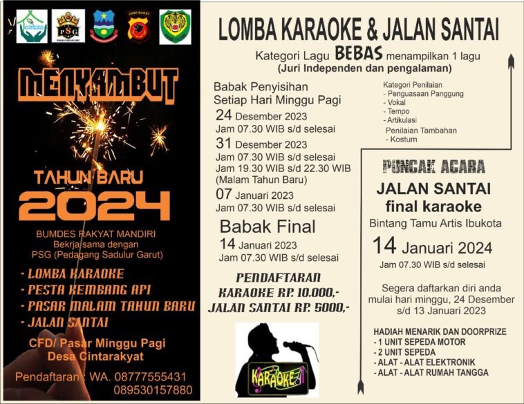 GARUTEXPO– Badan Usaha Milik Desa (BUMDes) Mandiri Cintarakyat bersinergi dengan Pedagang Sadulur Garut (PSG) untuk memeriahkan pergantian Tahun Baru 2024 dengan penuh semangat. Rangkaian acara termasuk Lomba Karaoke, Pesta Kembang Api Pasar Malam, dan Jalan Sehat.