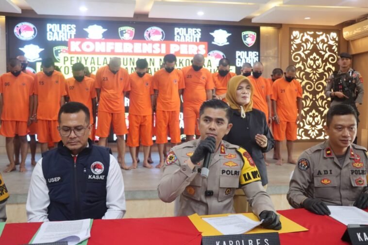 GARUTEXPO– Dalam periode September hingga Oktober 2024, Sat Res Narkoba Polres Garut berhasil mengungkap jaringan narkotika dengan total 18 tersangka yang terlibat dalam 13 kasus berbeda. Prestasi ini diungkapkan dalam konferensi pers, Senin (04/11/2024), dipimpin langsung oleh Kapolres Garut AKBP Mochamad Fajar Gemilang, S.I.K., M.H., M.I.K., dan didampingi Waka Polres Kompol Dhoni Erwanto, S.Si., S.I.K., M.H., M.I.K., Kasat Narkoba AKP Usep Sudirman, S.H., serta Kasi Humas Ipda Susilo Adhi P, S.H.