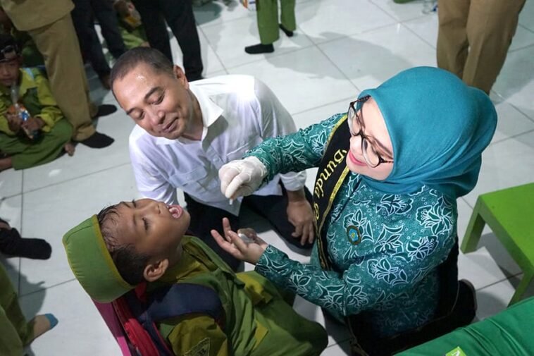 GARUTEXPO, Surabaya- Wali Kota Surabaya Eri Cahyadi bersama Ketua Tim Penggerak (TP) PKK Kota Surabaya Rini Indriyani meninjau pelaksanaan Sub Pekan Imunisasi Nasional (PIN) Polio putaran kedua di TK dan SD Almanar, Jalan Pakal Madya No.3, Selasa (20/2/2024). Di pelaksanaan Sub PIN Polio putaran kedua ini, ia menargetkan, percepatan Sub PIN Polio bisa tuntas 100 persen di hari ketiga, Rabu (21/2/2024).