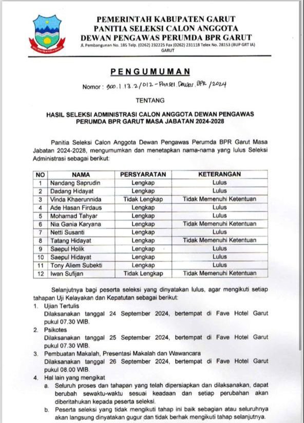 Abdul Rahman menegaskan bahwa keempat kriteria tersebut sangat penting untuk dijadikan panduan oleh Pansel dalam memilih Dewan Pengawas Perumda BPR Garut untuk periode mendatang. Hal ini penting mengingat Perumda BPR Garut merupakan lembaga keuangan perkreditan yang sepenuhnya dimiliki oleh Pemerintah Kabupaten Garut.
