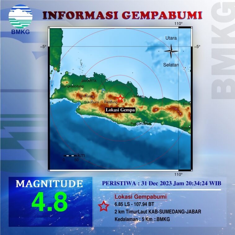 GARUTEXPO– Kabupaten Sumedang dilanda gempa bumi berkekuatan magnitudo 4,8. Pusat gempa terletak di timur laut Sumedang dengan kedalaman 5 kilometer. Badan Meteorologi Klimatologi dan Geofisika (BMKG) Bandung melaporkan gempa ini dirasakan di sejumlah wilayah, termasuk Sumedang, Lembang, Subang, Bandung, dan Garut, Minggu, 31 Desember 2023, pukul 20.34 WIB