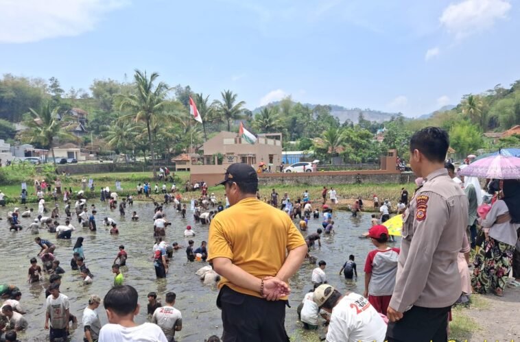 GARUTEXPO– Ratusan warga simpatisan pasangan Syakur Amin dan Putri Karlina calon Bupati dan Wakil Bupati Garut nomor urut 2, melaksanakan kampanye dengan kegiatan unik menangkap ikan di Sawah Dwi Fungsi, Kampung Soga, Desa Cangkuang, Kecamatan Leles, Kabupaten Garut, Minggu (13/10/2024).