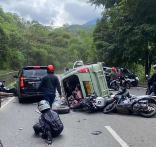 Dari video yang beredar, tampak angkutan umum tersebut terbalik di tengah jalan. Beberapa sepeda motor mengalami kerusakan berat, dan salah satu korban terlihat terbaring di sebuah parit. Kemacetan panjang tidak terhindarkan akibat insiden tersebut.