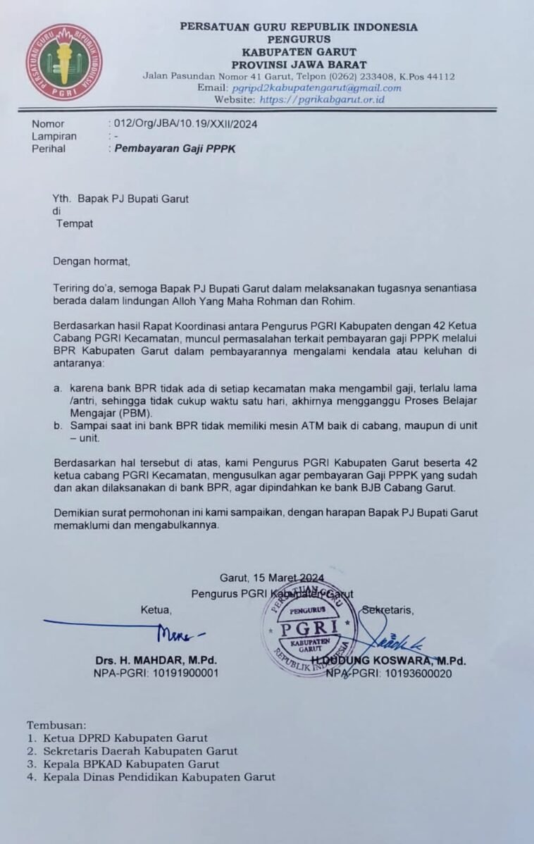 Dalam surat tersebut tercantum bahwa hasil rapat koordinasi PGRI Kabupaten Garut, salah satu isu yang diprioritaskan adalah kendala dalam pengambilan gaji PPPK di wilayah tersebut. Salah satu permasalahan yang disoroti adalah minimnya layanan Bank Garut di seluruh kecamatan, dengan beberapa kecamatan bahkan belum memiliki kantor cabang atau layanan ATM.