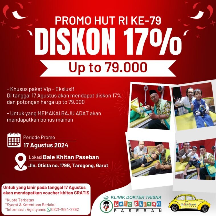 GARUTEXPO – Dalam rangka menyambut HUT RI ke-79, Klinik Dokter Trisna Bale Khitan Paseban menghadirkan berbagai promo menarik bagi masyarakat. Klinik ini memberikan vocer khitan gratis khusus untuk anak-anak yang lahir pada tanggal 17 Agustus. Selain itu, tersedia juga promo diskon sebesar 17 persen dengan potongan harga hingga Rp79.000 untuk layanan VIP eksklusif.