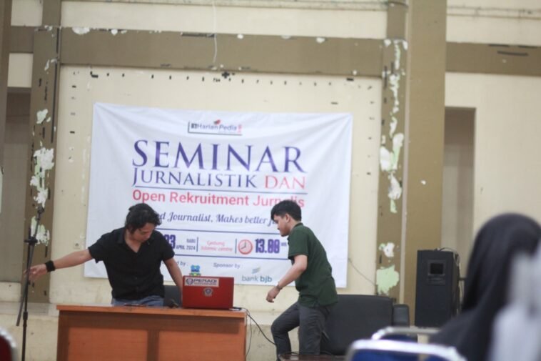 GARUTEXPO – Feri Citra Burama editor dari media Radar Garut menjadi pemateri dalam seminar jurnalistik yang diselenggarakan oleh media Harian Pedia di aula Islamic Centre Garut, jalan Pramuka, Kelurahan Pakuwon, Kecamatan Garut Kota, (3/4/2024).