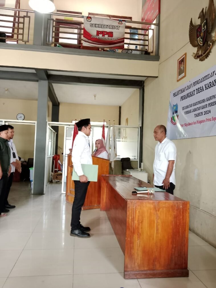 GARUTEXPO – Pemerintah Desa Karangtengah, Kecamatan Kadungora, Kabupaten Garut, resmi melaksanakan pelantikan perangkat desa, Rabu (23/10/2024) di Aula Desa Karangtengah. Pada kesempatan ini, Cucu Oktaviani dilantik sebagai Kaur Perencanaan. Acara tersebut berlangsung khidmat dan dihadiri oleh Camat Kadungora beserta jajarannya, Babinsa, Bhabinkamtibmas, para kader, serta sejumlah tokoh masyarakat setempat.