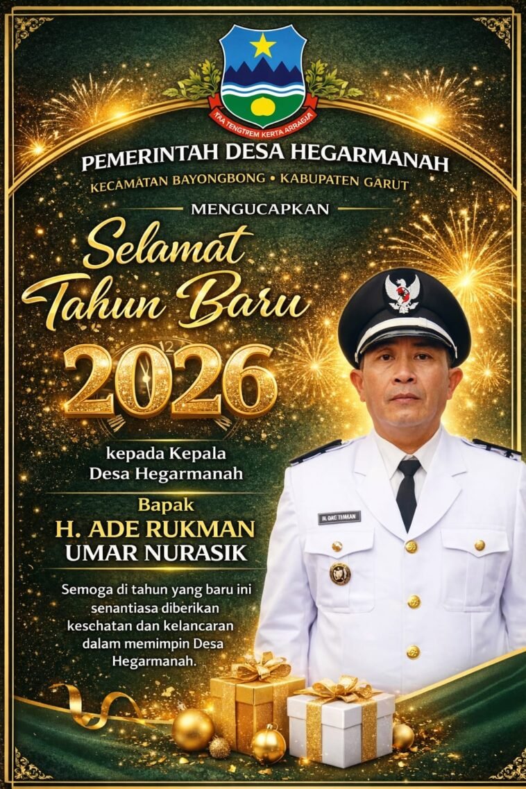 Garutexpo.com – Pemerintah Desa Hegarmanah, Kecamatan Bayongbong, Kabupaten Garut, menyampaikan ucapan Selamat Tahun Baru 2026 kepada Kepala Desa Hegarmanah, H. Ade Rukman Umar Nurasik. Ucapan tersebut menjadi bentuk doa dan harapan agar kepemimpinan desa di tahun yang baru semakin membawa kemajuan dan keberkahan bagi masyarakat.