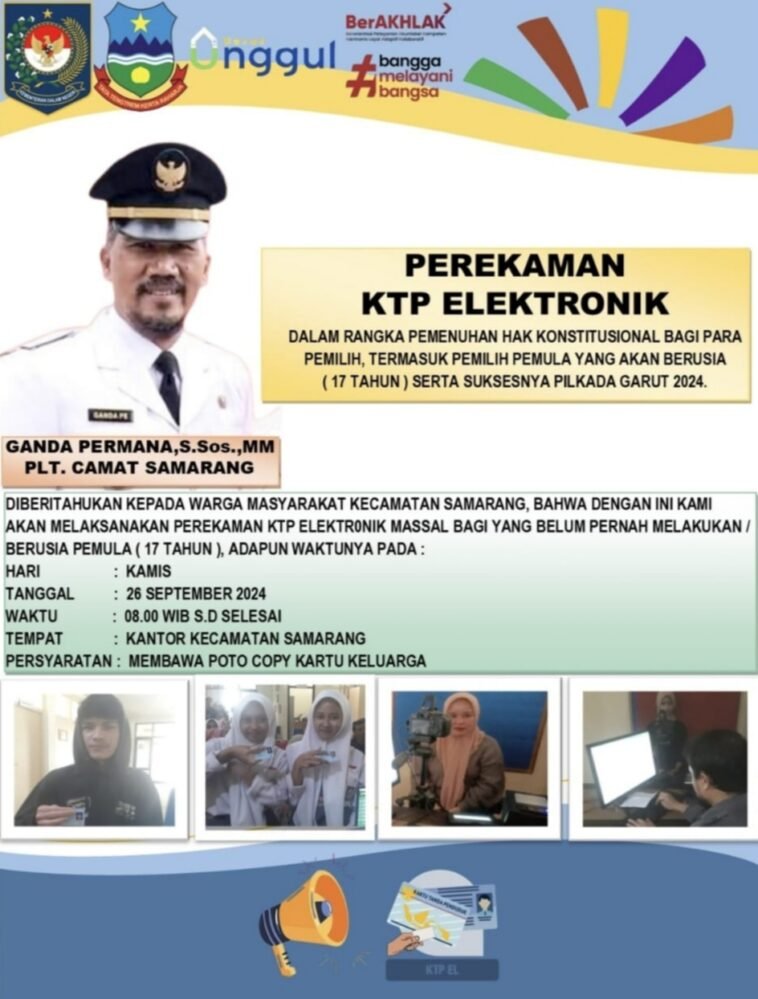 GARUTEXPO – Pemerintah Kecamatan Samarang akan melaksanakan perekaman KTP elektronik massal besok Kamis, 26 September 2024, di mulai pukul 08 pagi sampai selesai di kantor Kecamatan Samarang, Kabupaten Garut.