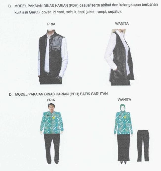 Adapun untuk hari Rabu dan Jumat tidak mengalami perubahan. Hari Rabu tetap menggunakan PDH kemeja putih, sedangkan hari Jumat menggunakan pakaian olahraga dari pukul 07.30-11.30 WIB dan PDH batik Garutan dari pukul 11.30-16.30 WIB.