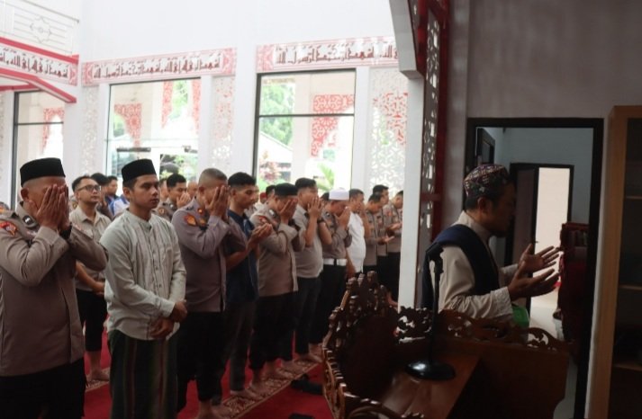 GARUTEXPO – Polres Garut menggelar shalat ghaib di Masjid Nurul Hakim Mapolres Garut sebagai bentuk doa bersama untuk para korban penembakan yang terjadi di Kabupaten Way Kanan, Lampung, Selasa (18/3).