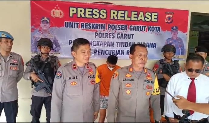 GARUTEXPO– Polsek Garut Kota Polres Garut menggelar press release terkait aksi pencurian sepeda motor yang viral di dunia maya. Kapolsek Garut Kota, AKP Zainuri, S.Pd., memimpin kegiatan tersebut yang dihadiri oleh Kasi Humas Polres Garut Ipda Susilo Adhi P, S.H., anggota Polsek Garut Kota, dan awak media Kabupaten Garut, Senin, 26 Februari 2024.