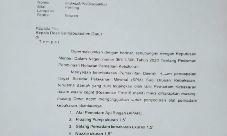 Garutexpo.com — Program pengadaan Alat Pemadam Api Ringan (APAR) di desa-desa se-Kabupaten Garut yang diinisiasi melalui Surat Edaran Penjabat (Pj) Bupati Garut, Barnas Ajidin, Nomor 640/4608/Pc/Disdamkar Tahun 2024, kini menuai sorotan tajam. Program yang sejatinya bertujuan meningkatkan kesiapsiagaan desa terhadap ancaman kebakaran itu diduga melenceng dari aturan awal dan menimbulkan potensi penyimpangan.