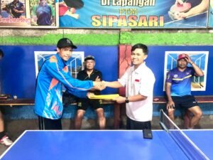 PTMSI oleh Ketua Umum PTMSI Garut, Hasan Basri, S.Ag, kepada Ketua Koordinator Tenis Meja Kecamatan Cikajang, H. Pepen, di PTM Sipasari Cikajang, Ahad, 12 Mei 2024.
