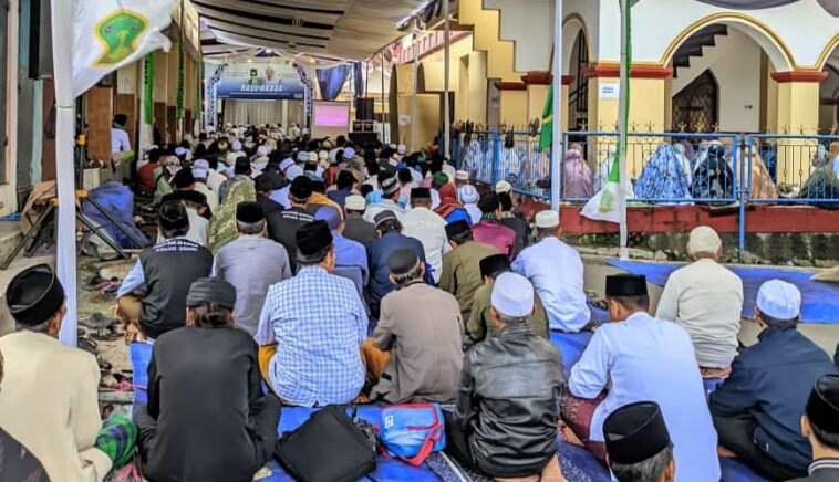GARUTEXPO — Ribuan jamaah Thoriqoh At-Tijaniyah dari berbagai daerah di Kabupaten Garut, termasuk dari Bandung, Padalarang dan Bogor, memadati Pondok Pesantren Al Falah Biru, Desa Mekargalih, Kecamatan Tarogong Kidul, Kabupaten Garut, Jum’at, 4 Juli 2025. Kehadiran mereka dalam rangka mengikuti Haul Akbar dan Ijtima Wadzifah dan Hailalah Thoriqoh At-Tijaniyah.