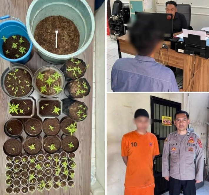 Barang bukti yang diamankan meliputi satu paket ganja kering dalam plastik klip bening dan ratusan batang pohon ganja yang ditanam di berbagai wadah. Polisi menduga kasus ini tidak berdiri sendiri.