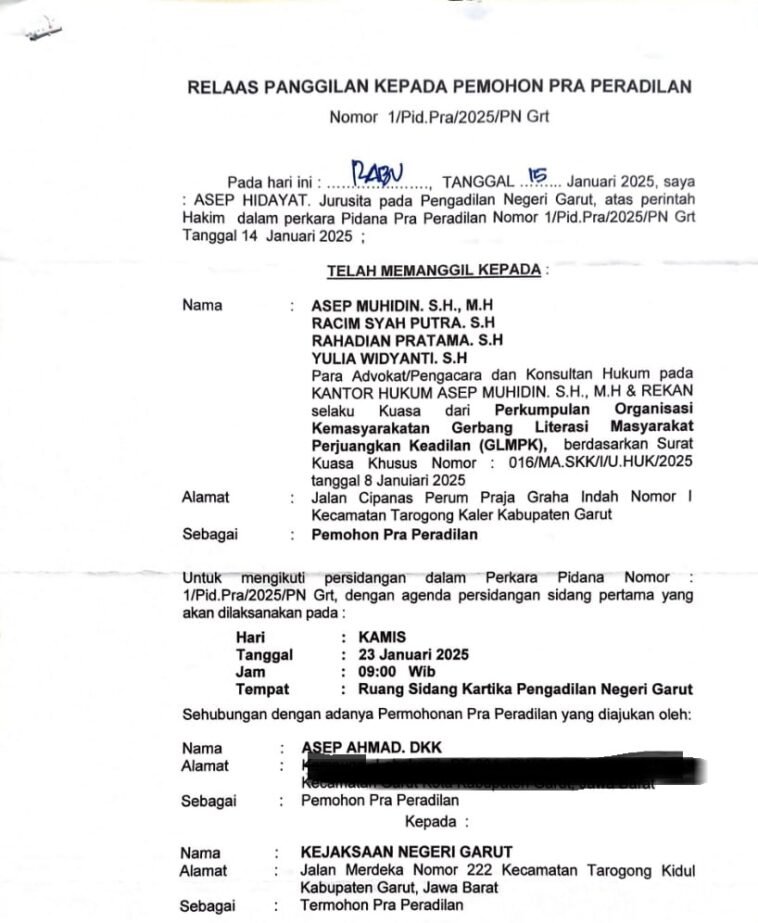 “Benar, Pengadilan Negeri Garut telah memanggil GLMPK melalui kantor hukum kami untuk hadir dalam sidang perdana praperadilan dengan nomor perkara 1/Pid.Pra/2025/PN Grt pada 23 Januari 2025,” kata Asep saat dihubungi garutexpo.com melalui sambungan WhatsApp, Sabtu (18/1/2025).