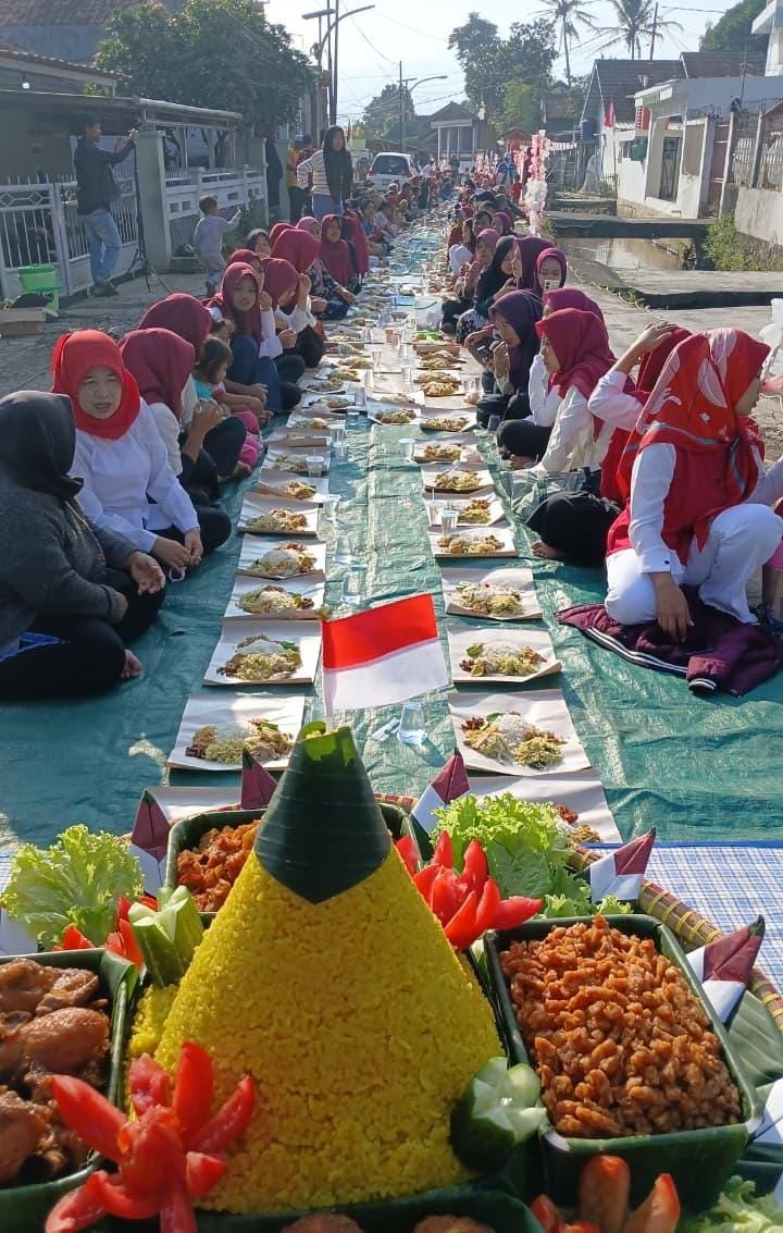 Kehadiran warga dari berbagai RW, termasuk emak-emak yang datang berbondong-bondong dari RW 26, semakin menambah semarak acara. Suasana guyub rukun tergambar jelas dari senyum dan tawa warga yang menikmati hidangan secara bersama-sama di sepanjang jalan.