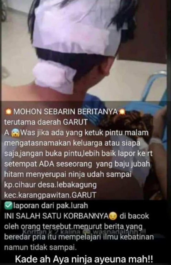 Dalam pesan tersebut, disebutkan bahwa pelaku mengenakan pakaian hitam menyerupai ninja dan melakukan penganiayaan terhadap salah satu warga. Berita ini pun memicu berbagai spekulasi di kalangan warga setempat.