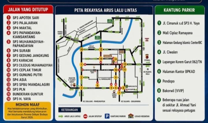Dalam rangka mendukung kelancaran dan keamanan acara, pihak Satlantas Polres Garut akan menerapkan rekayasa arus lalu lintas serta penutupan sejumlah ruas jalan strategis mulai pukul 13.00 WIB hingga kegiatan selesai.